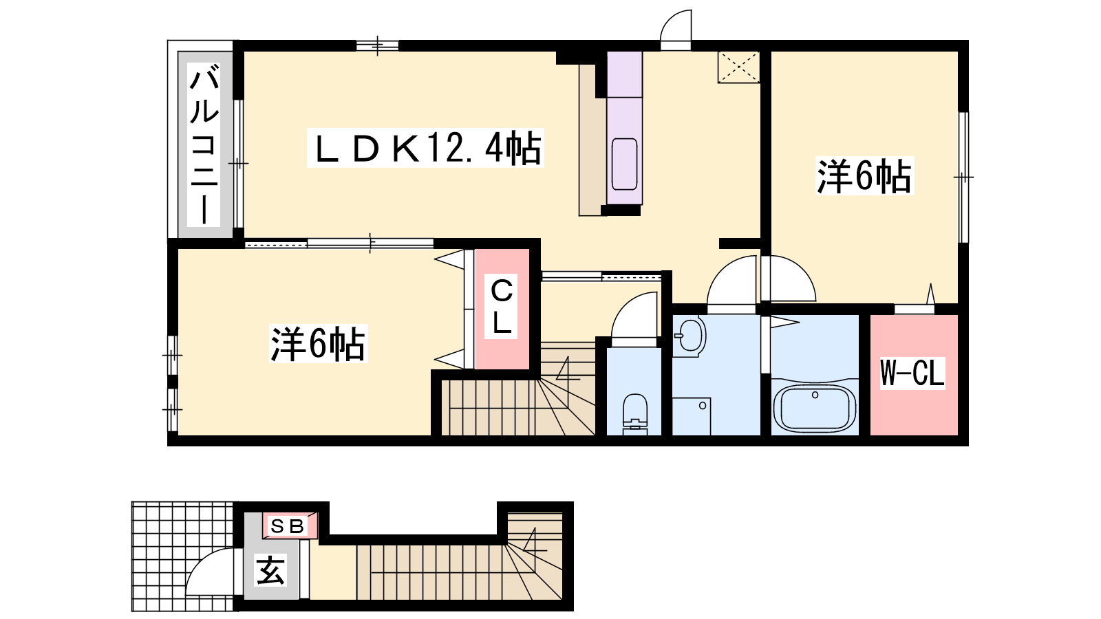 - LDK12.4帖、洋室6帖、洋室6帖