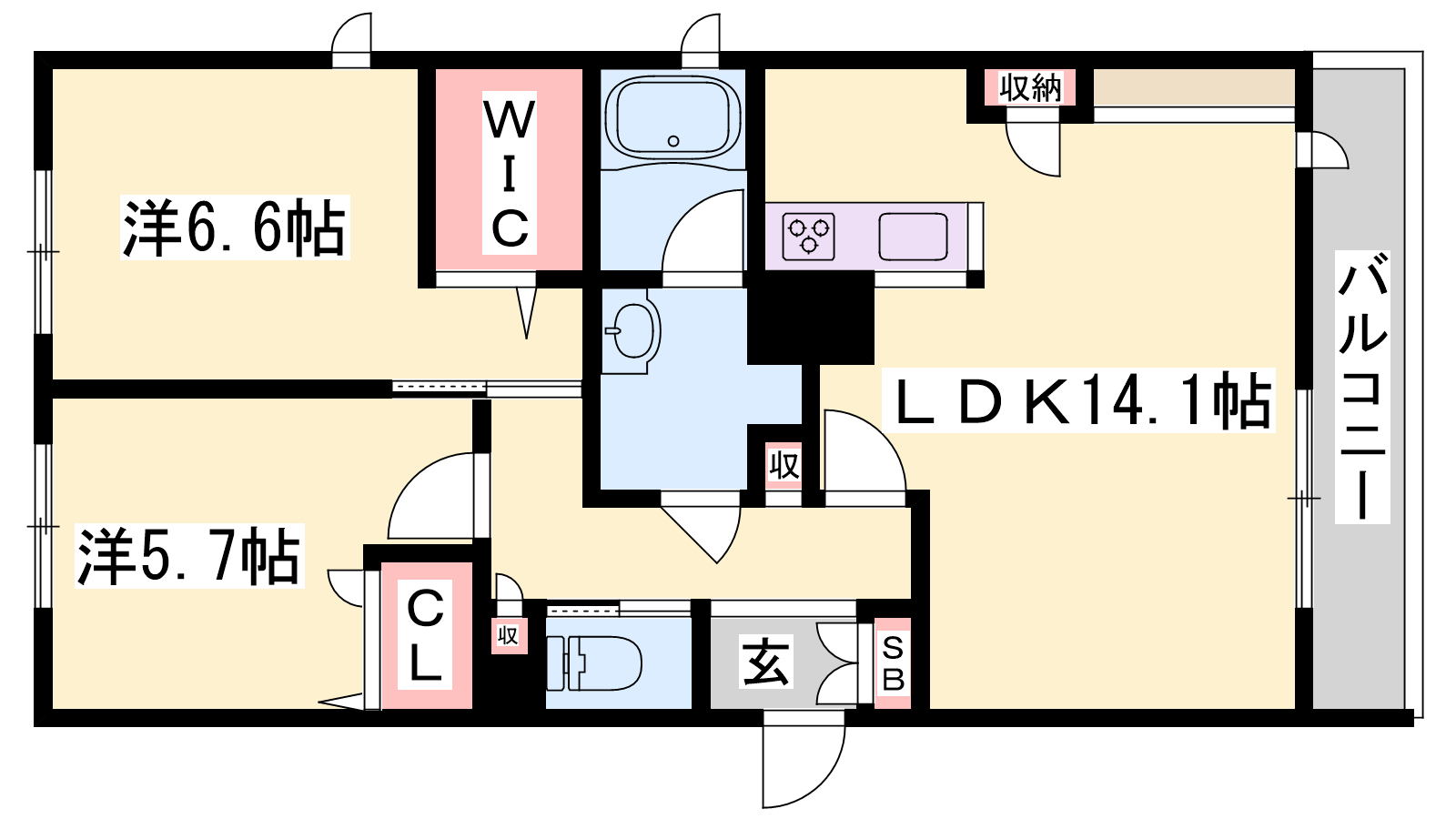- LDK14.1帖、洋室6.6帖、洋室5.7帖
