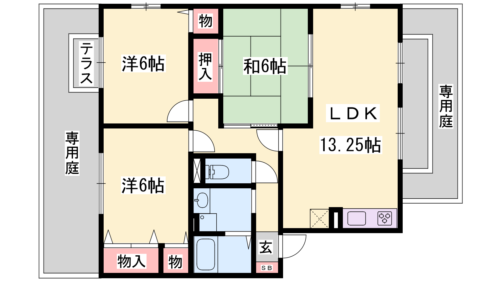 - LDK13.2帖、洋室6帖、洋室6帖、和室6帖