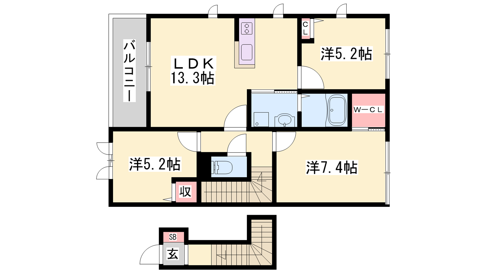 - LDK13.3帖、洋室7.4帖、洋室5.2帖、洋室5.2帖