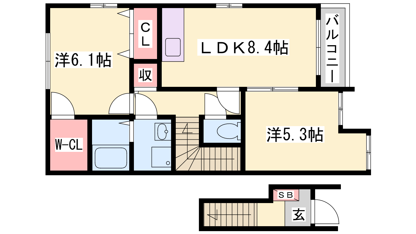 - LDK8.4帖、洋室6.1帖、洋室5.3帖