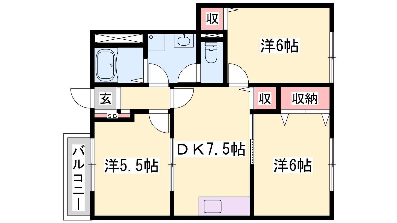 - DK7.5帖、洋室6帖、洋室6帖、和室6帖