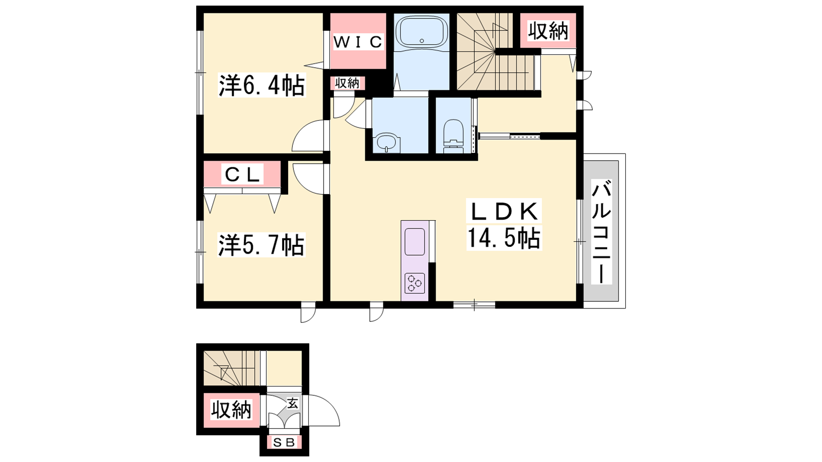 - LDK14.5帖、洋室6.4帖、洋室5.7帖