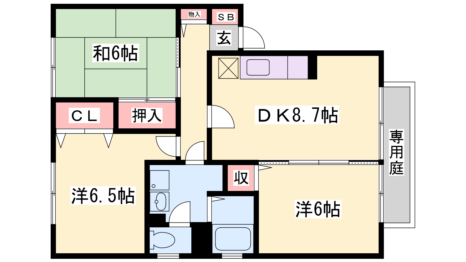 - DK8.7帖、洋室6.5帖、洋室6帖、和室6帖