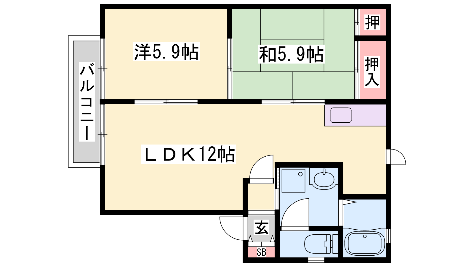 - LDK12帖、洋室5.9帖、和室5.9帖