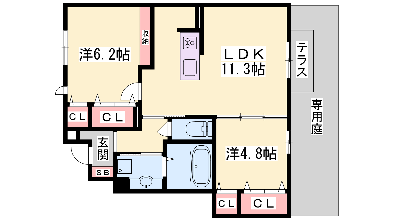 - LDK11.3帖、洋室6.2帖、洋室4.8帖
