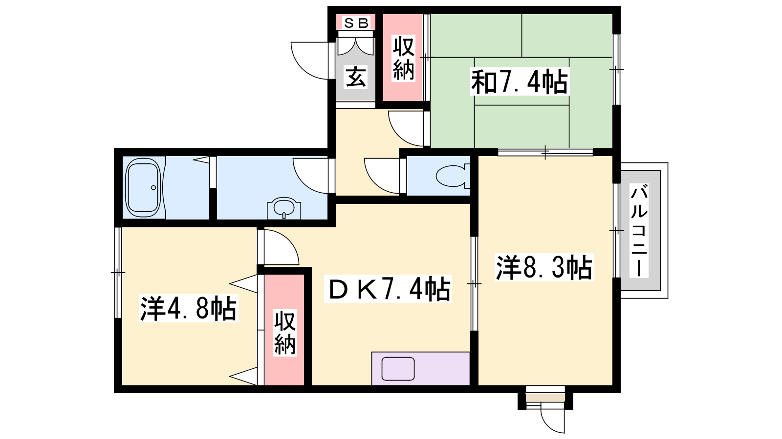 - DK7.4帖、洋室8.3帖、洋室4.8帖、和室7.4帖