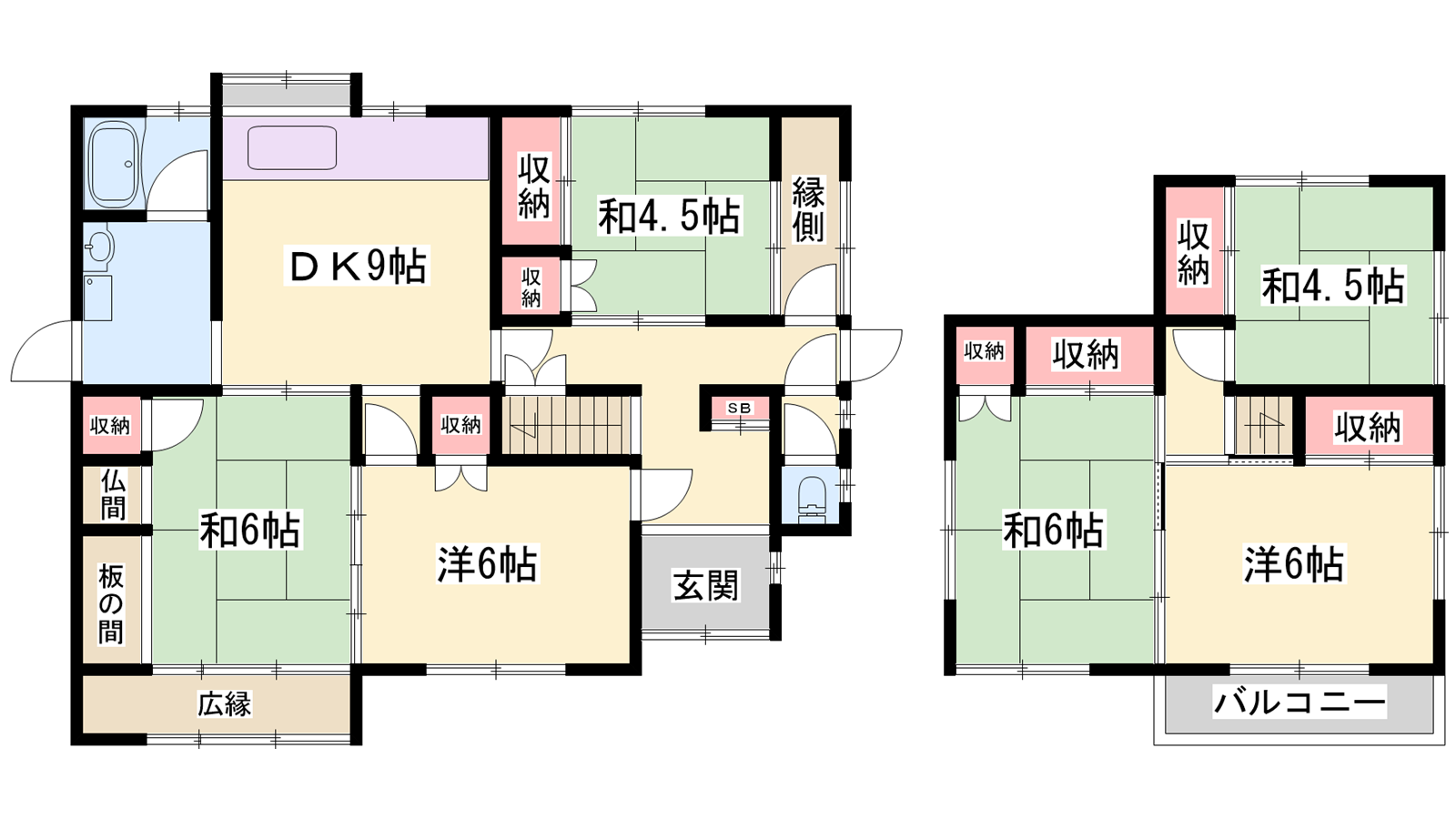 - DK9帖、洋室6帖、洋室6帖、和室6帖、和室6帖、和室4.5帖、和室4.5帖