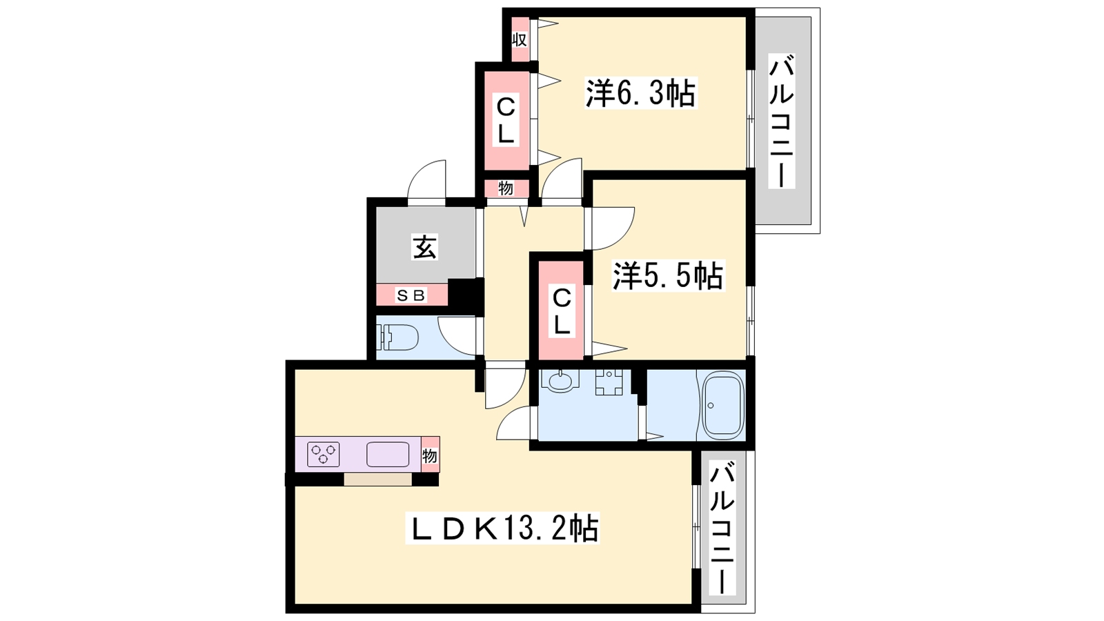 - LDK13.2帖、洋室6.3帖、洋室5.5帖