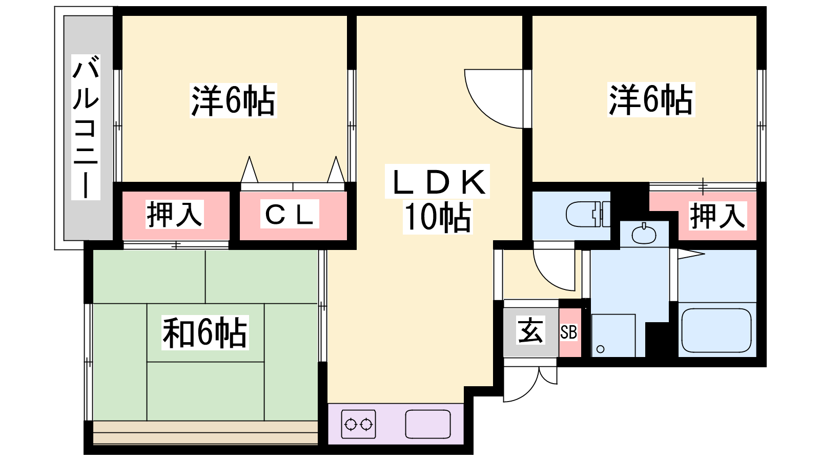 - LDK10帖、洋室6帖、洋室6帖、和室6帖