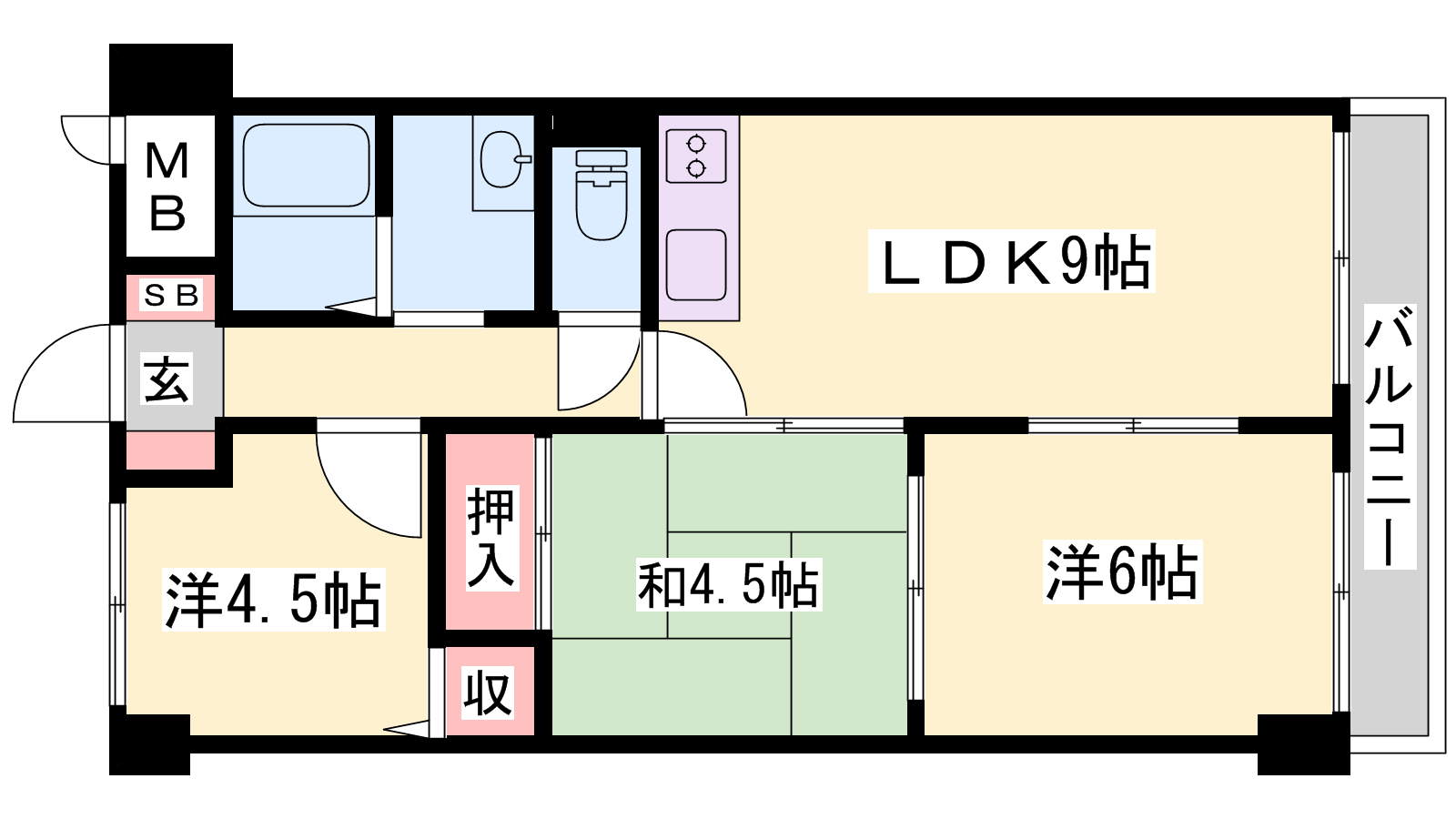 - LDK9帖、洋室6帖、洋室4.5帖、和室4.5帖