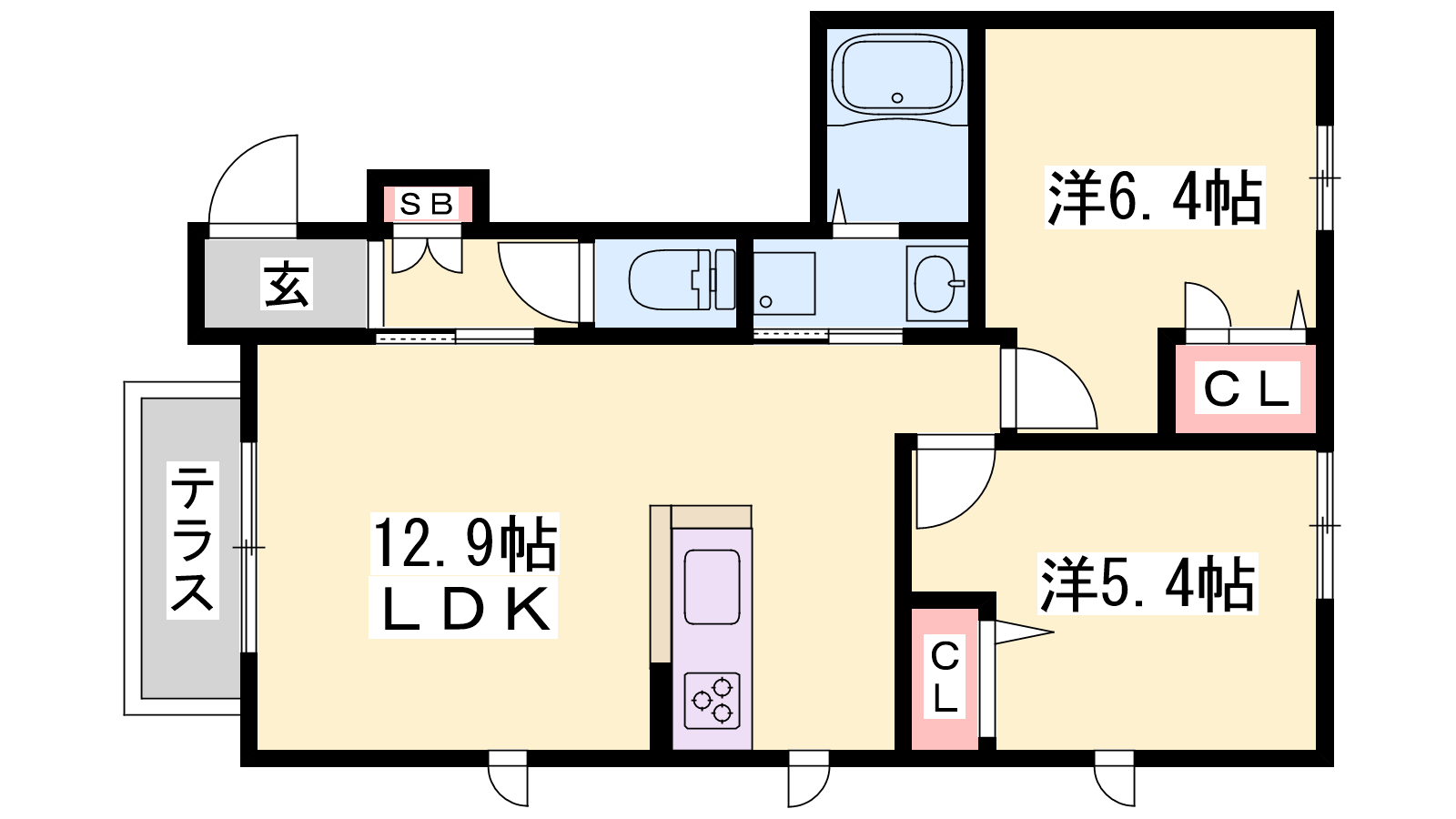 - LDK12.9帖、洋室6.4帖、洋室5.4帖