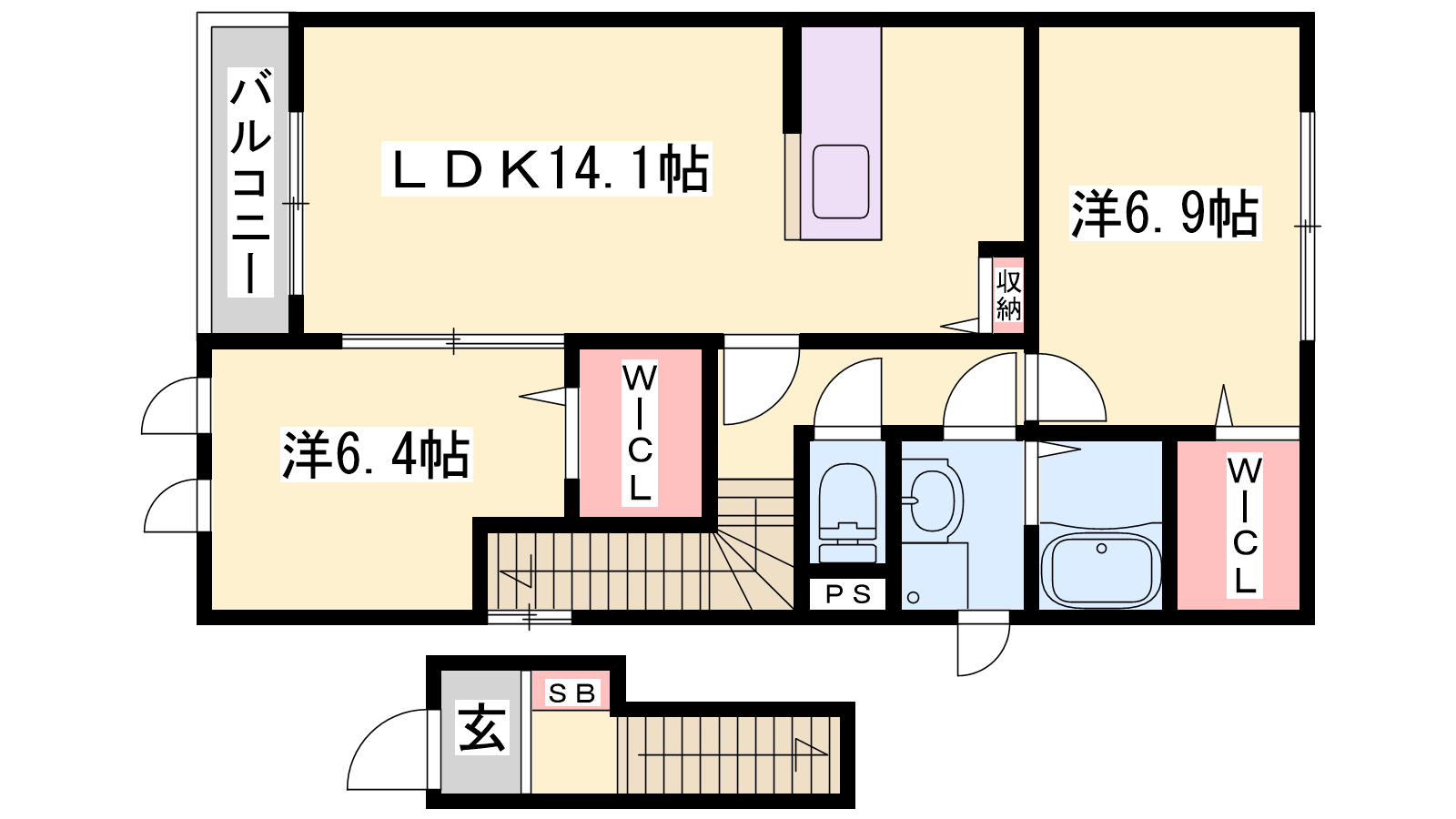 - LDK14.1帖、洋室6.9帖、洋室6.4帖