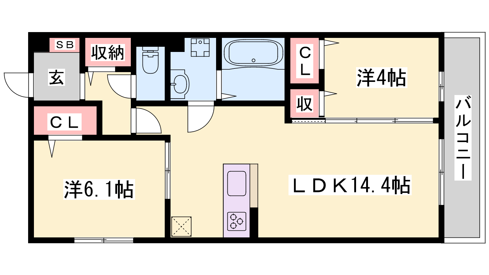 - LDK14.4帖、洋室6.1帖、洋室4帖