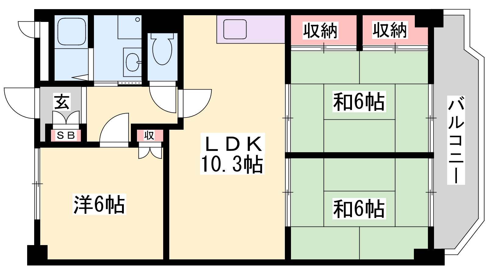 - LDK10.3帖、洋室6帖、和室6帖、和室6帖