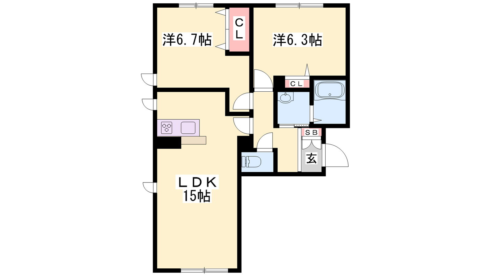 - LDK15帖、洋室6.7帖、洋室6.3帖