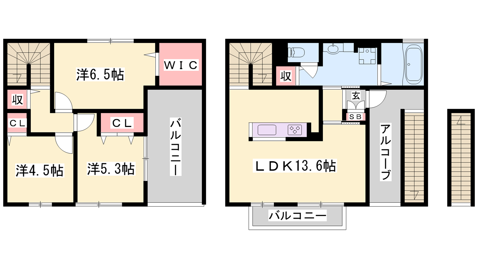 - LDK13.6帖、洋室6.5帖、洋室5.3帖、洋室4.5帖