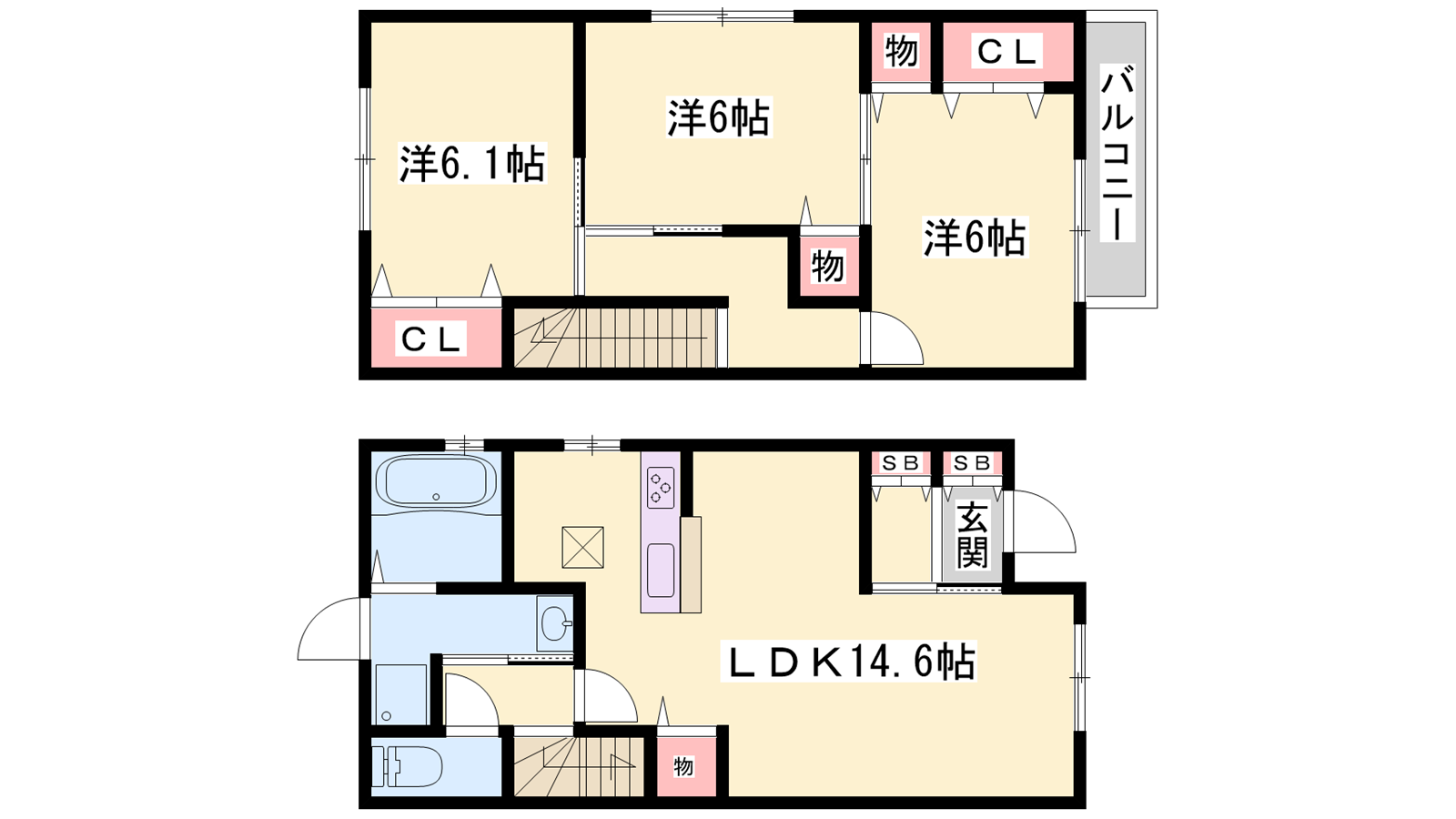 - LDK14.6帖、洋室6.1帖、洋室6帖、洋室6帖