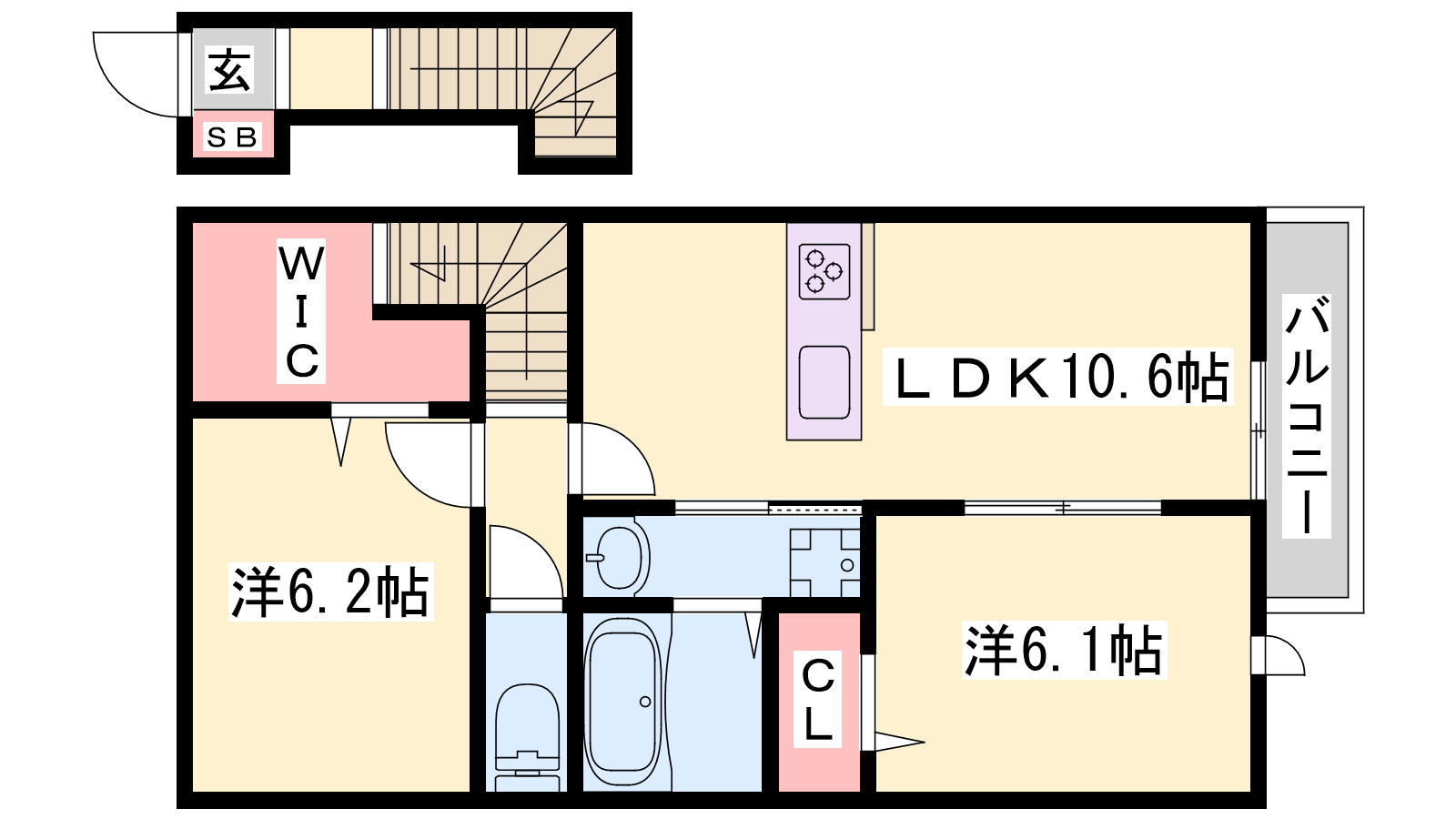 - LDK10.5帖、洋室6.2帖、洋室6.1帖