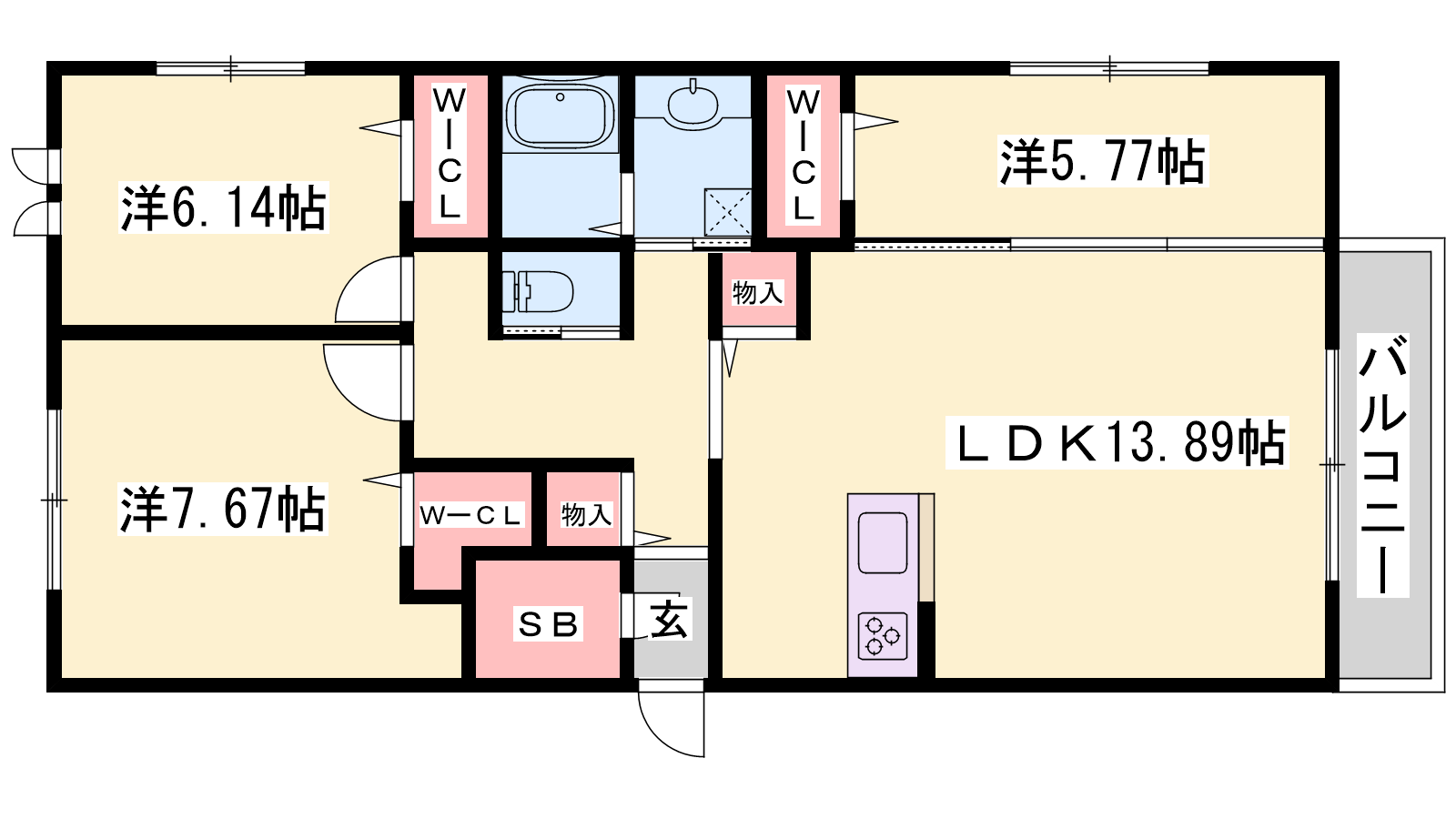 - LDK13.89帖、洋室7.67帖、洋室6.14帖、洋室5.77帖