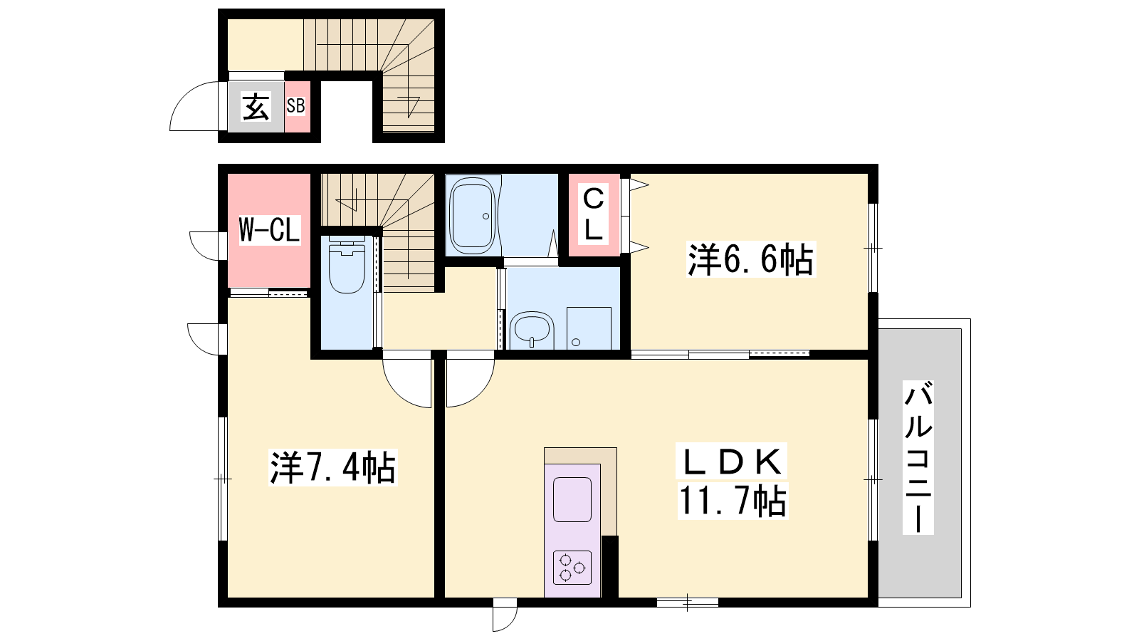 - LDK11.7帖、洋室7.4帖、洋室6.6帖