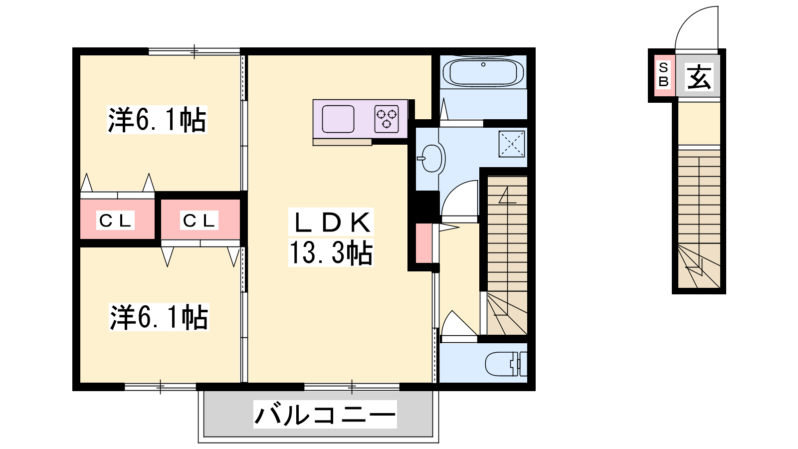 - LDK13.3帖、洋室6.1帖、洋室6.1帖