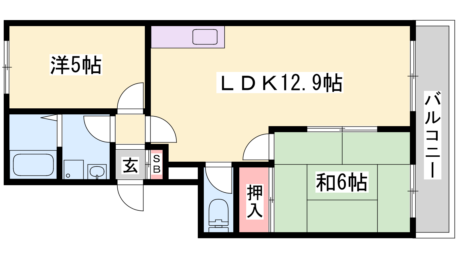 - LDK12.9帖、洋室5.5帖、和室6帖