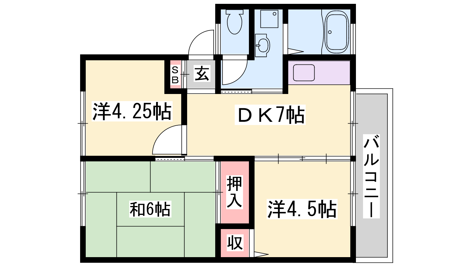 - DK7帖、洋室4.5帖、洋室4.25帖、和室6帖
