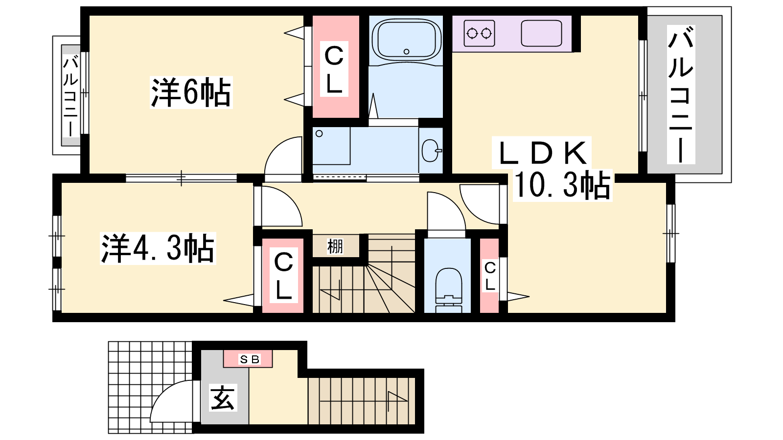 - LDK10.3帖、洋室6帖、洋室4.3帖