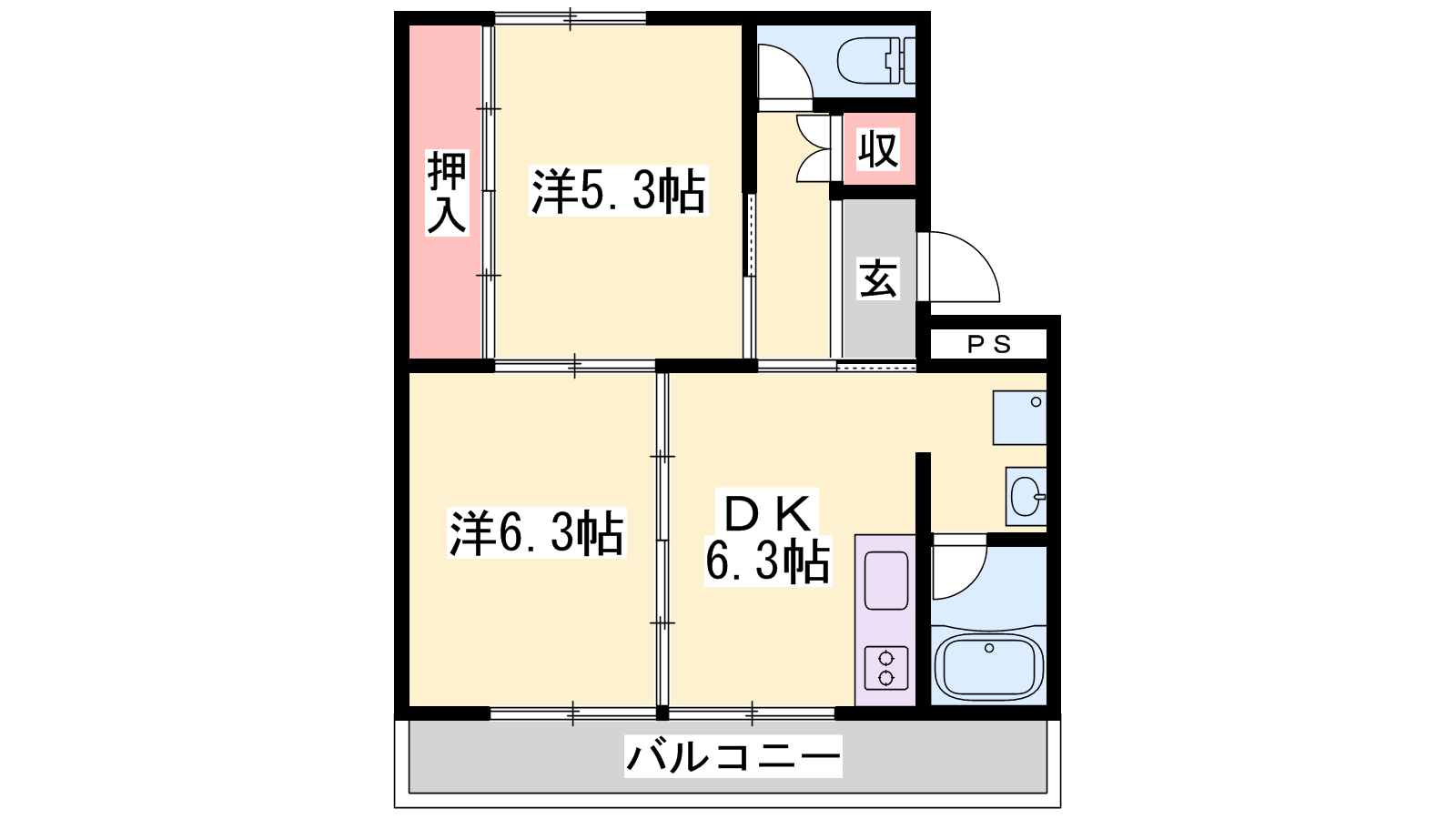 - DK6.3帖、洋室6.3帖、洋室5.3帖