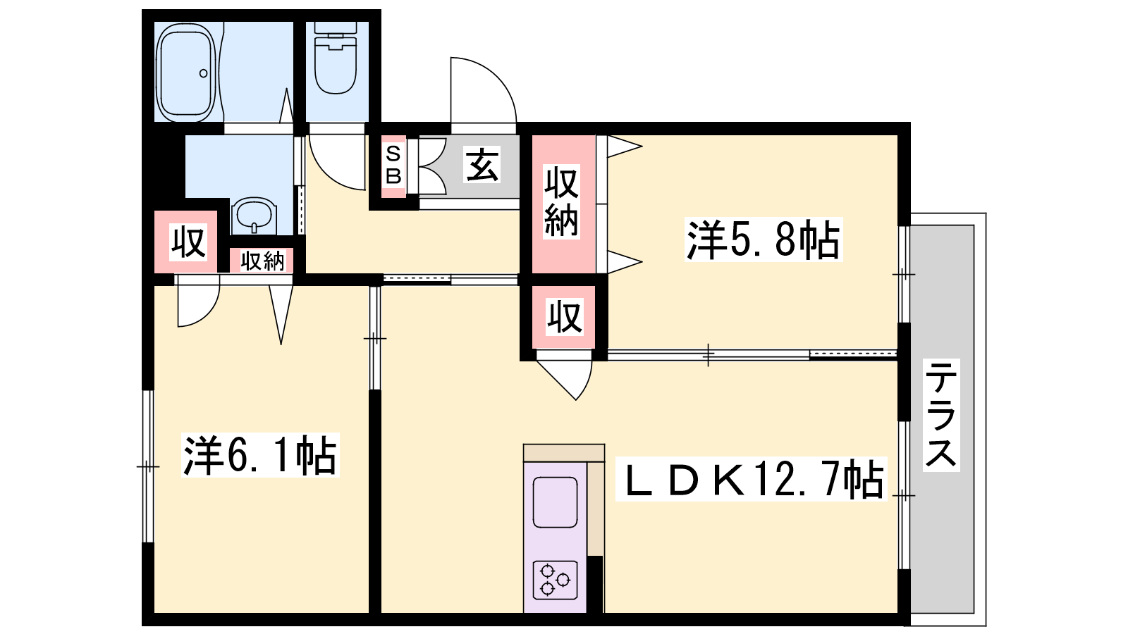 - LDK12.7帖、洋室6.1帖、洋室5.8帖