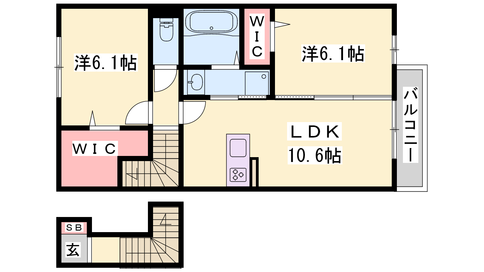 - LDK10.6帖、洋室6.1帖、洋室6.1帖