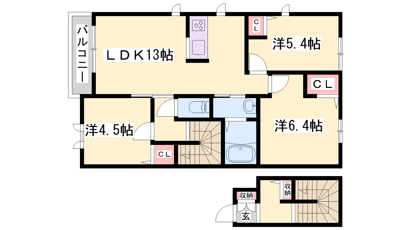 - LDK13帖、洋室6.4帖、洋室5.4帖、洋室4.5帖