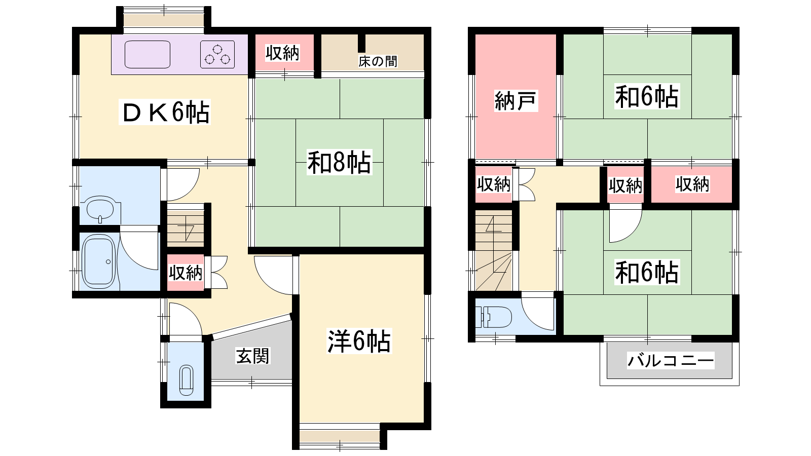 - DK6帖、洋室6帖、和室8帖、和室6帖、和室6帖