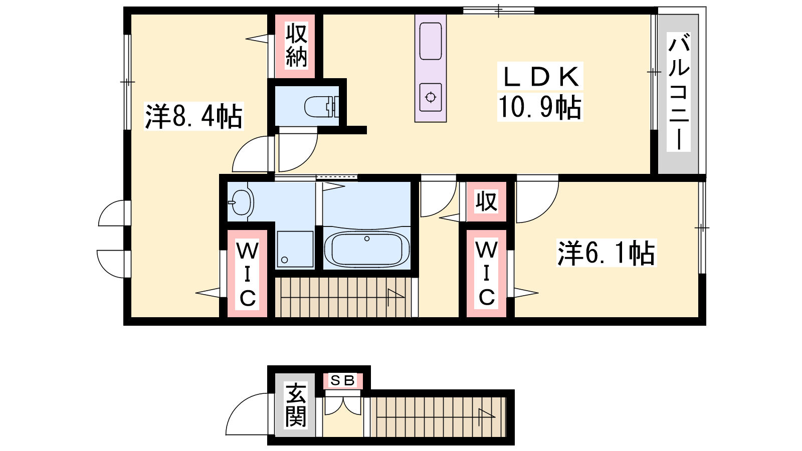 - LDK10.9帖、洋室8.4帖、洋室6.1帖
