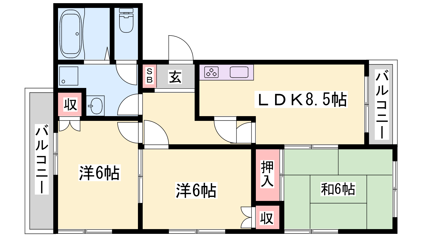 - LDK8.5帖、洋室6帖、洋室6帖、和室6帖