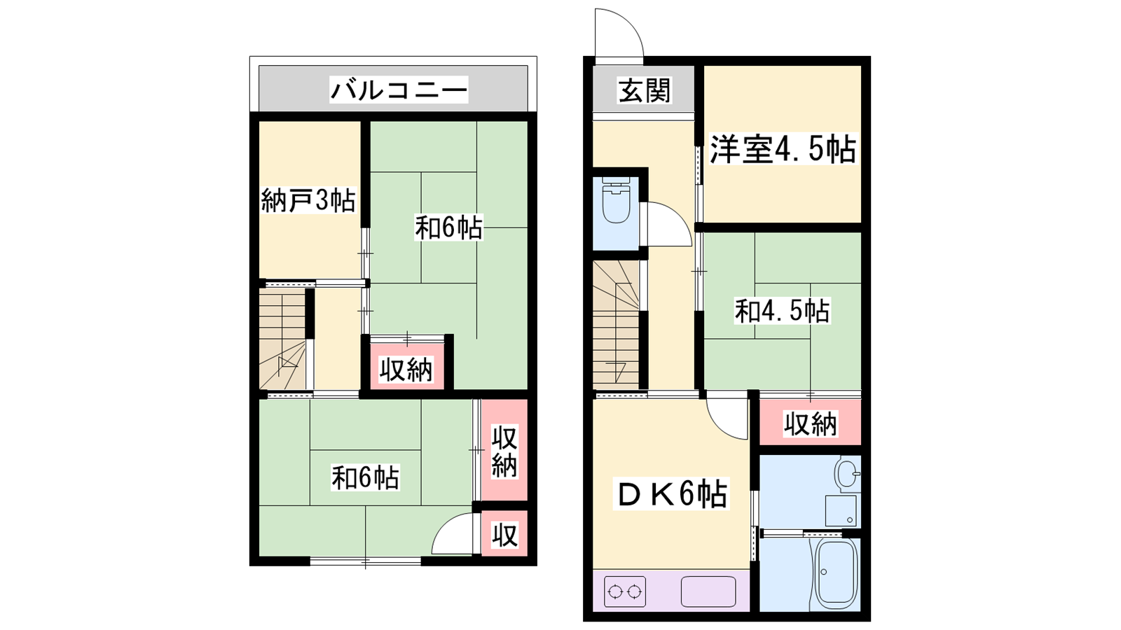 - LDK6帖、洋室6帖、和室6帖、洋室4.5帖、和室4.5帖、S3帖