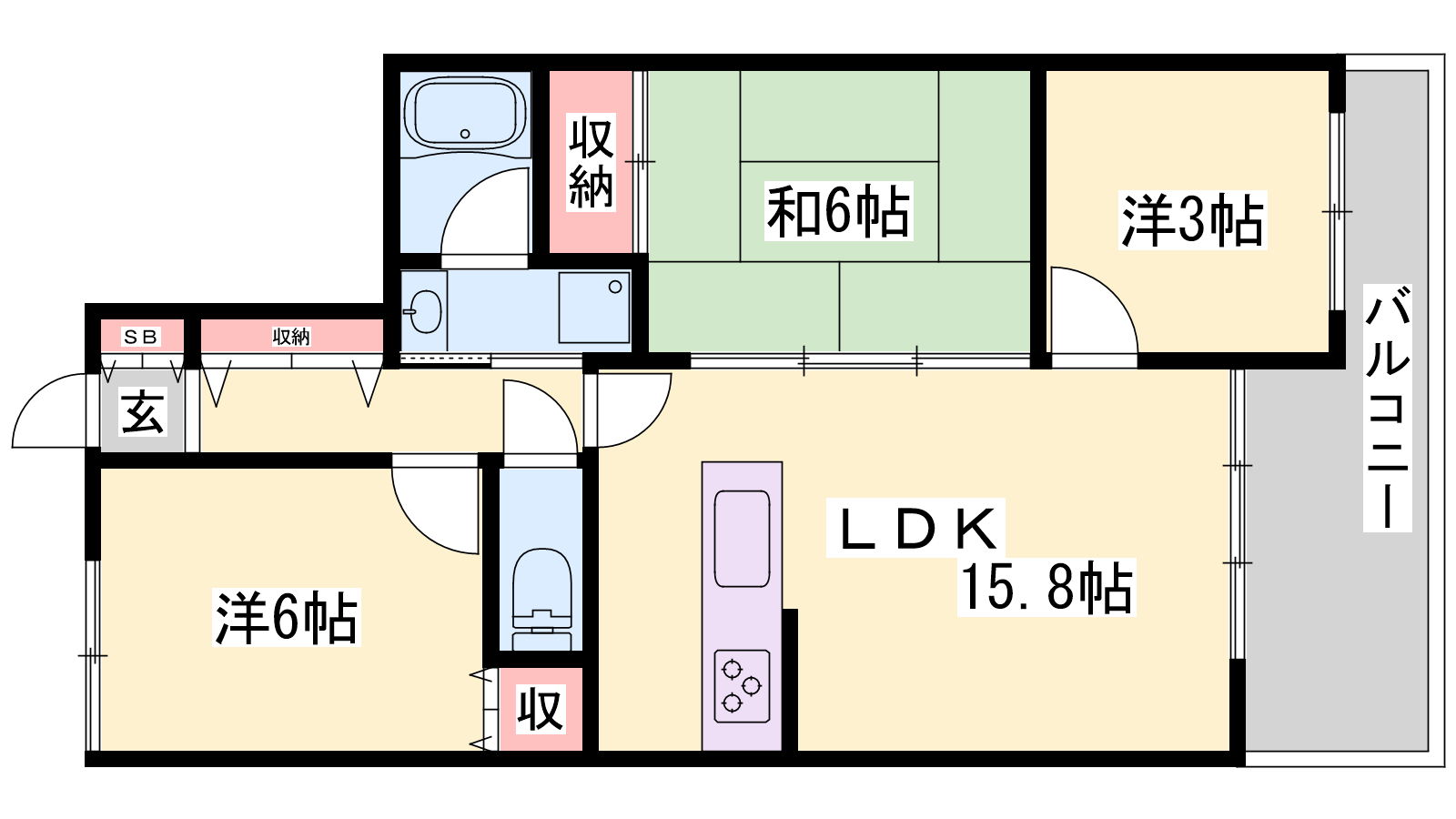 - LDK15.8帖、洋室6帖、和室6帖、洋室3帖