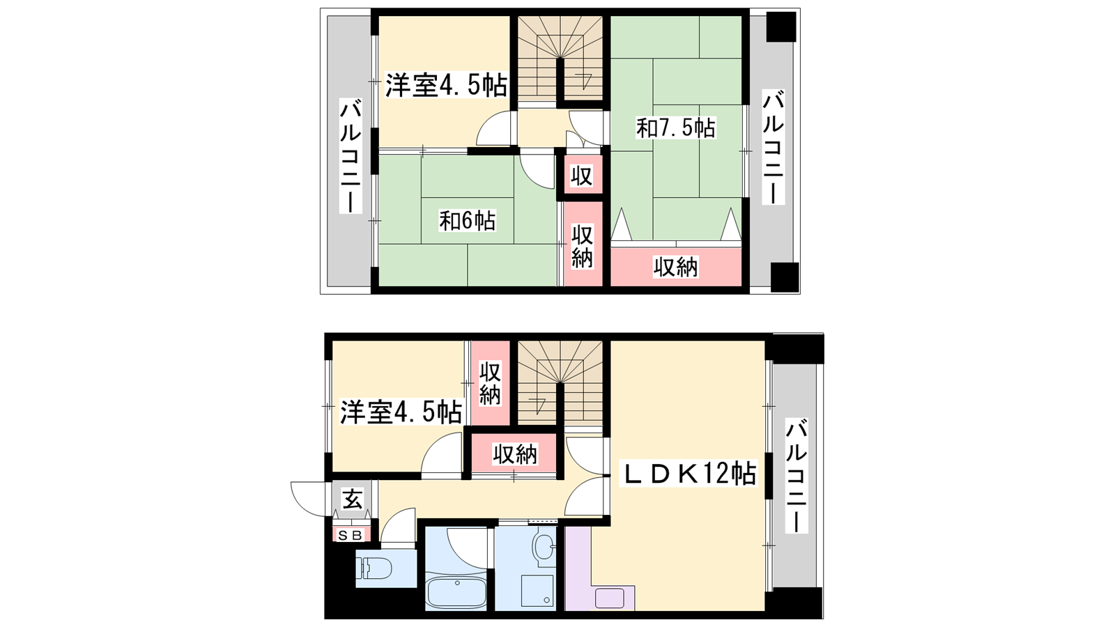 - LDK12帖、洋室4.5帖、洋室4.5帖、和室7.5帖、和室6帖