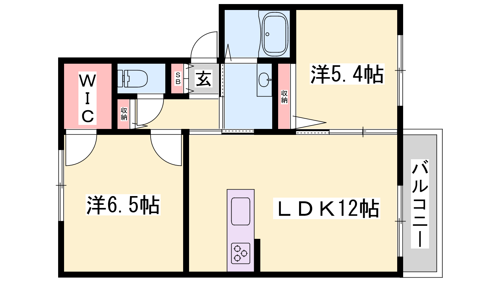 - LDK12帖、洋室6.5帖、洋室5.4帖