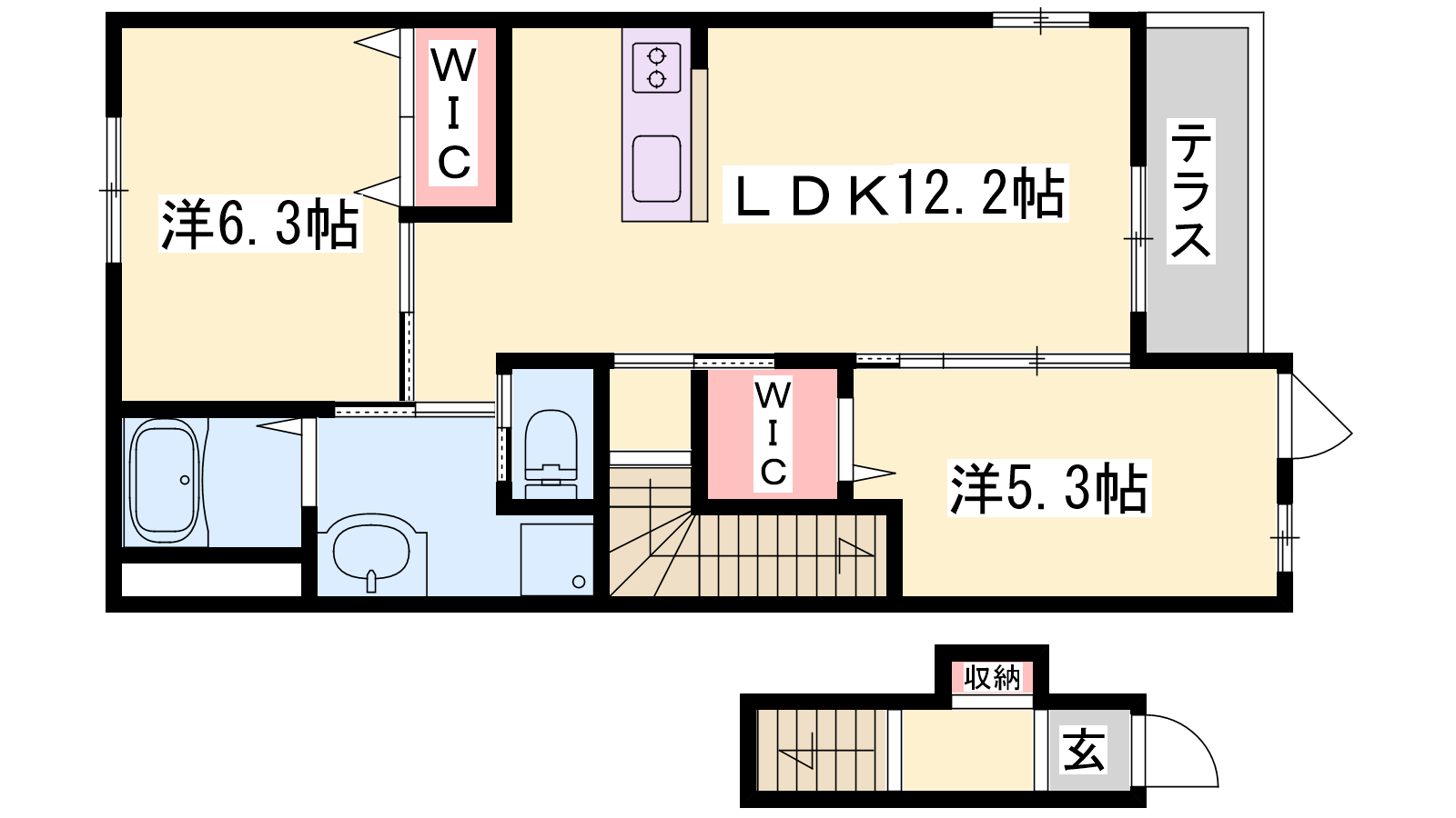 - LDK12.2帖、洋室6.3帖、洋室5.3帖