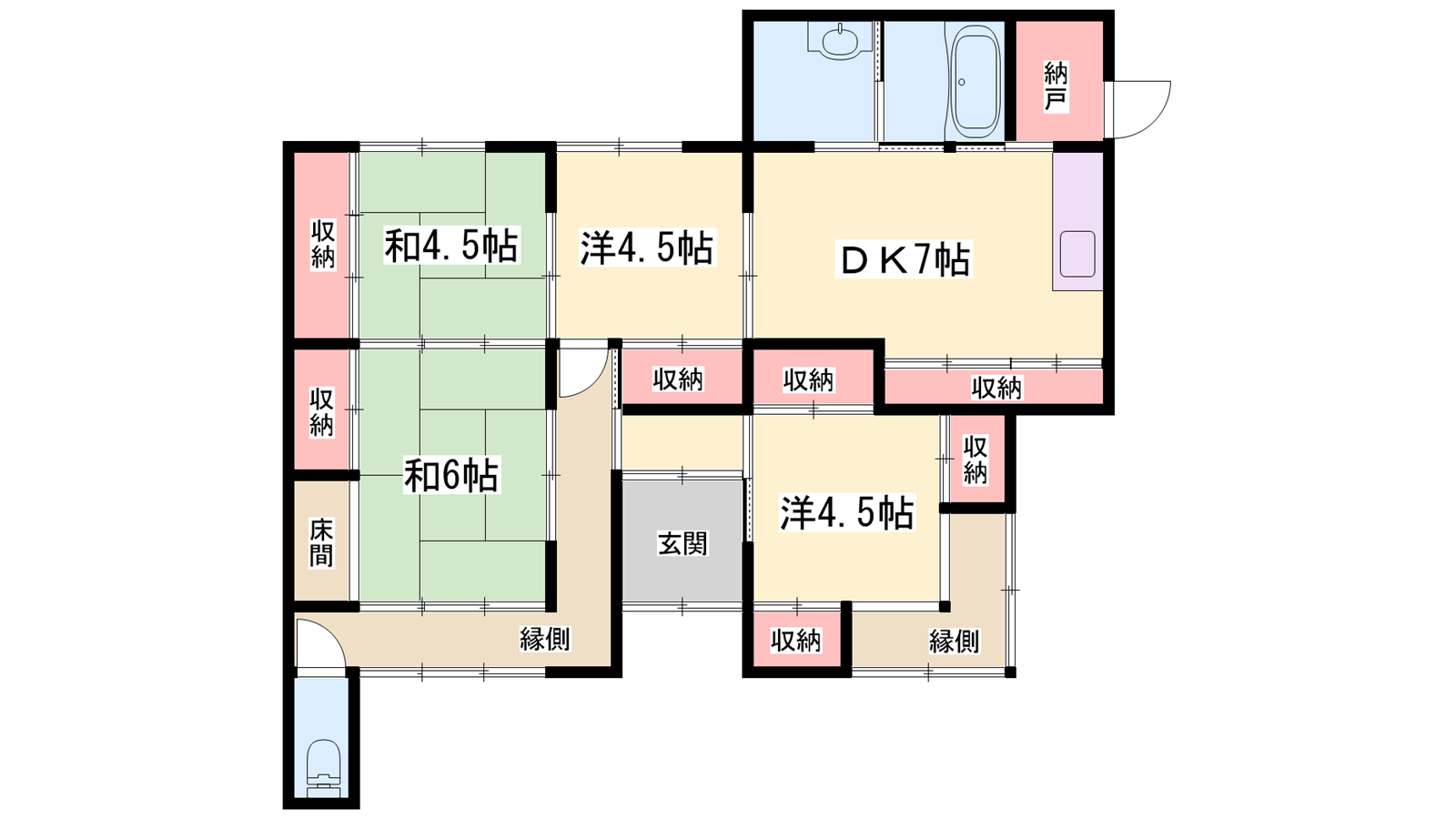 - DK7帖、洋室4.5帖、洋室4.5帖、和室6帖、和室4.5帖