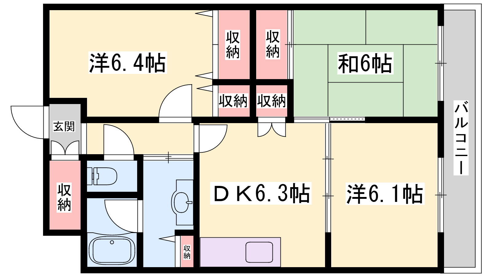 - DK6.3帖、洋室6.4帖、洋室6.1帖、和室6帖