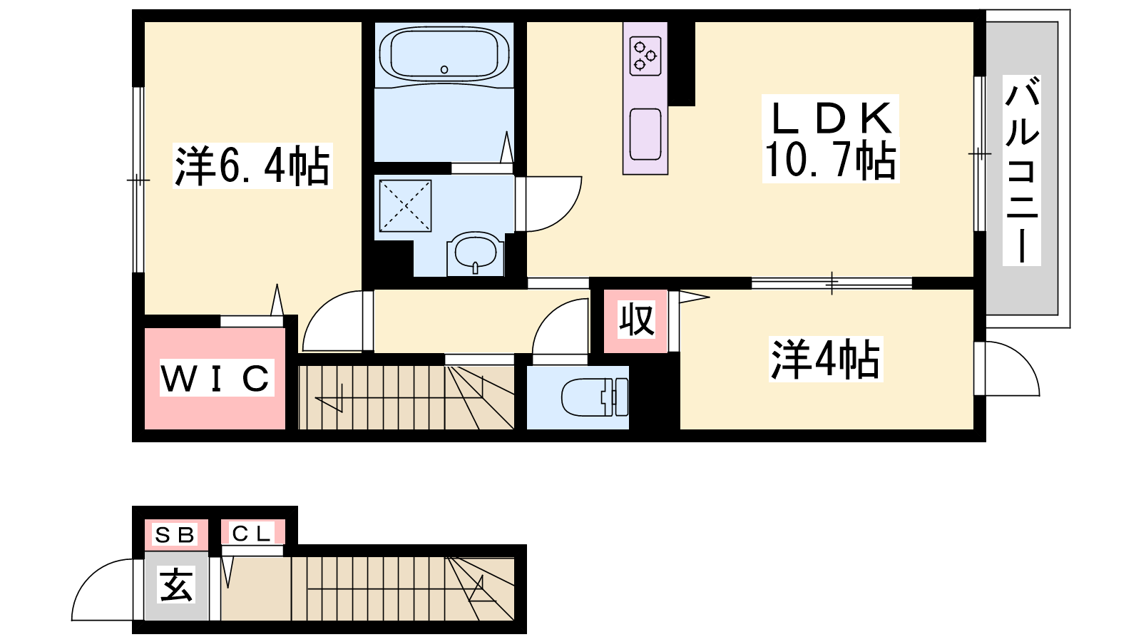 - LDK10.7帖、洋室6.4帖、洋室4帖