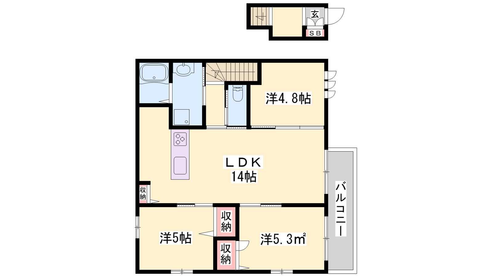 - LDK14帖、洋室5.3帖、洋室5帖、洋室4.8帖