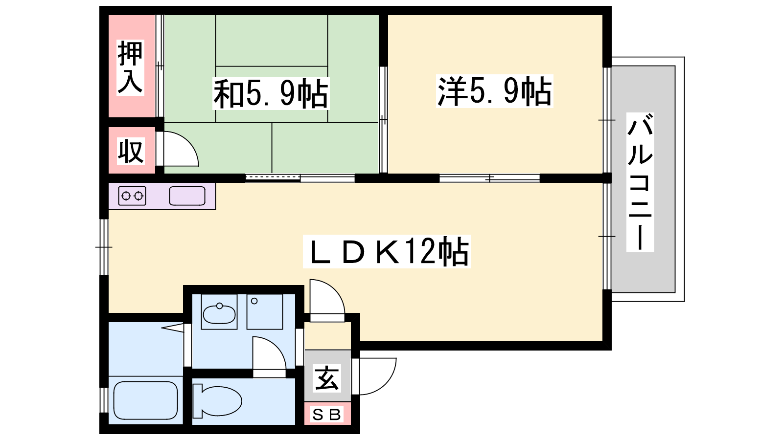 - LDK12帖、洋室5.9帖、和室5.9帖