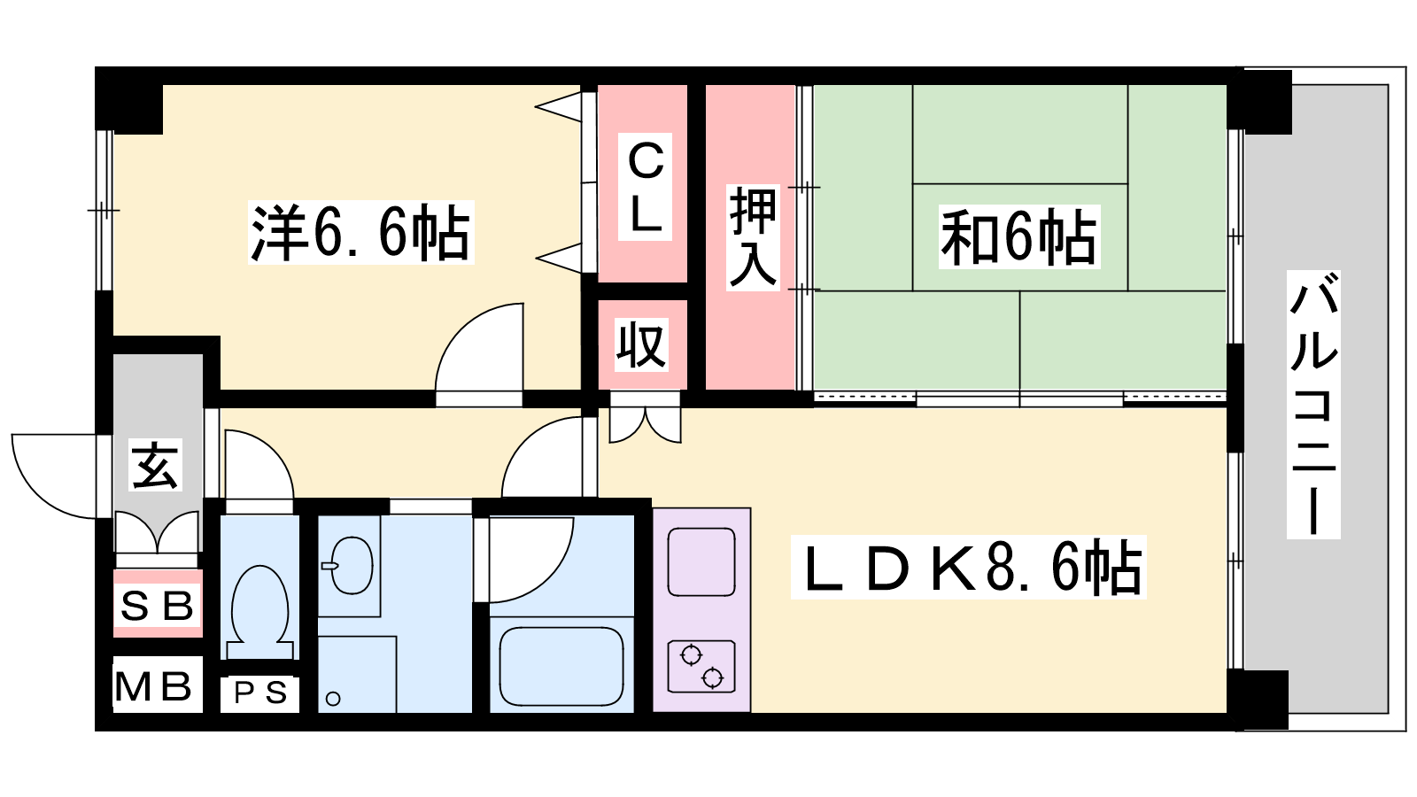 - LDK8.6帖、洋室6.6帖、和室6帖
