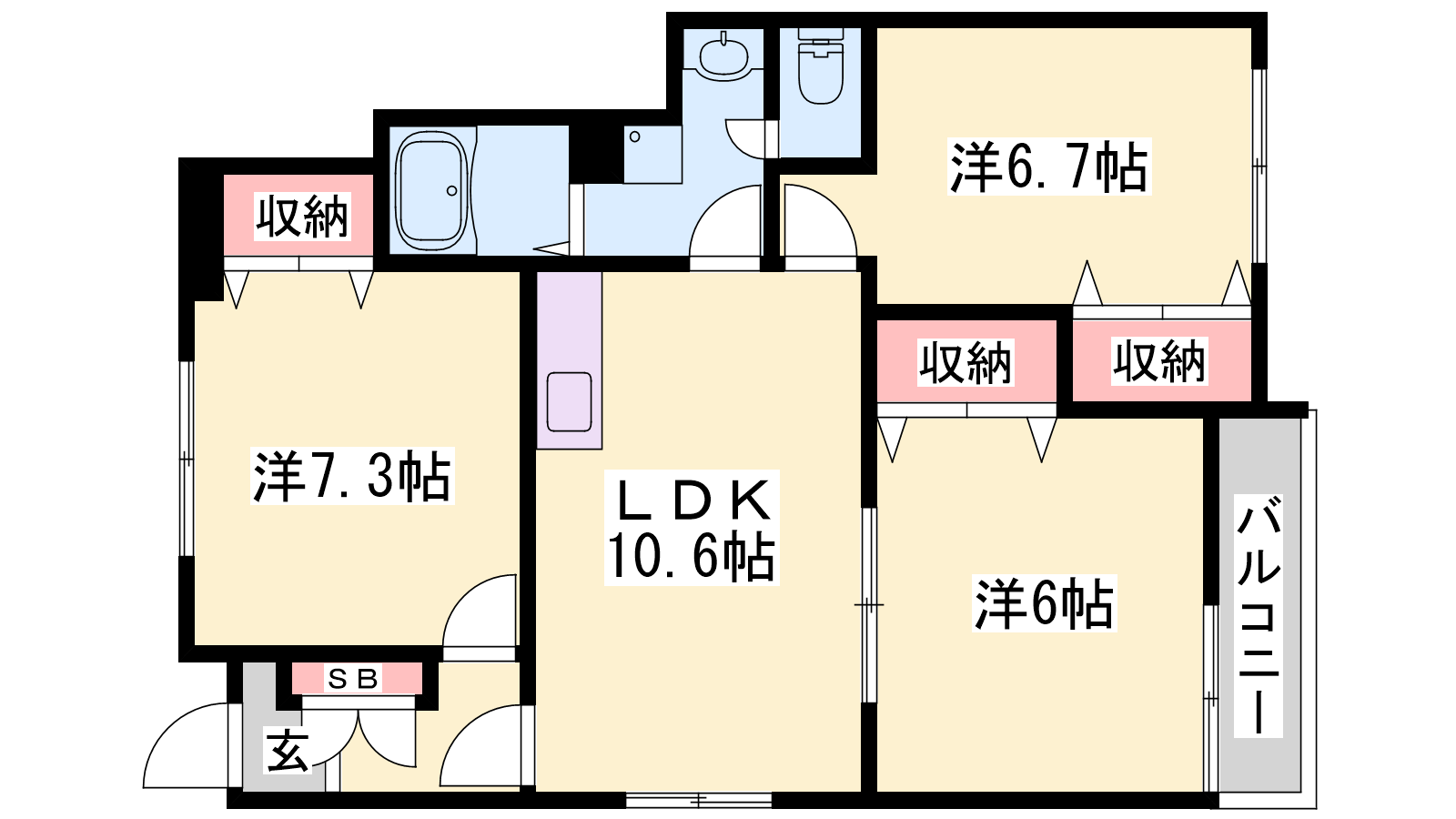 - LDK10.6帖、洋室7.3帖、洋室6.7帖、洋室6帖