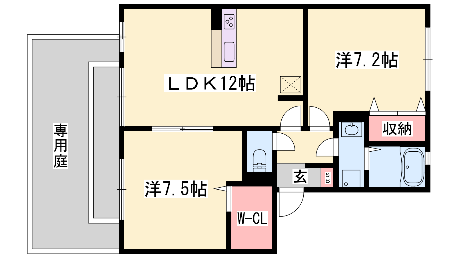 - LDK12帖、洋室7.5帖、洋室7.2帖