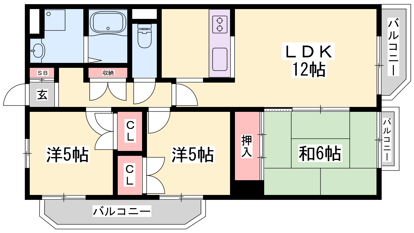 - LDK12.9帖、洋室5帖、洋室5帖、和室6帖